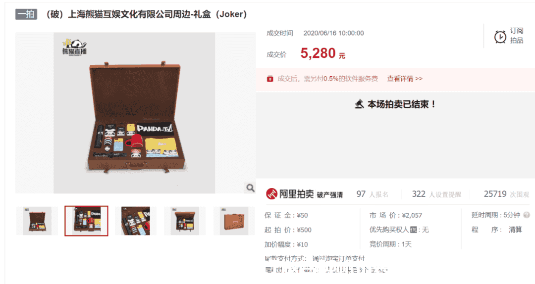 早在2020年6月,熊貓互娛就對其周邊產品進行過一次拍賣,主要標的為周邊禮盒、福袋、馬克杯、手機殼等。這些限量款周邊受到熱捧,最后也是高溢價率拍出。其中,一款禮盒起拍價為500元,最終成交價5289元,溢價率達958%;一個起拍價150元的福袋賣出2020元,溢價率1246.67%。