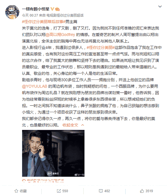 6月11日凌晨,電視劇《怪你過分美麗》出品方CEO在微博發文談男主角高以翔的幕后故事,稱“以翔是我遇到過的最能給人帶來溫暖的人。