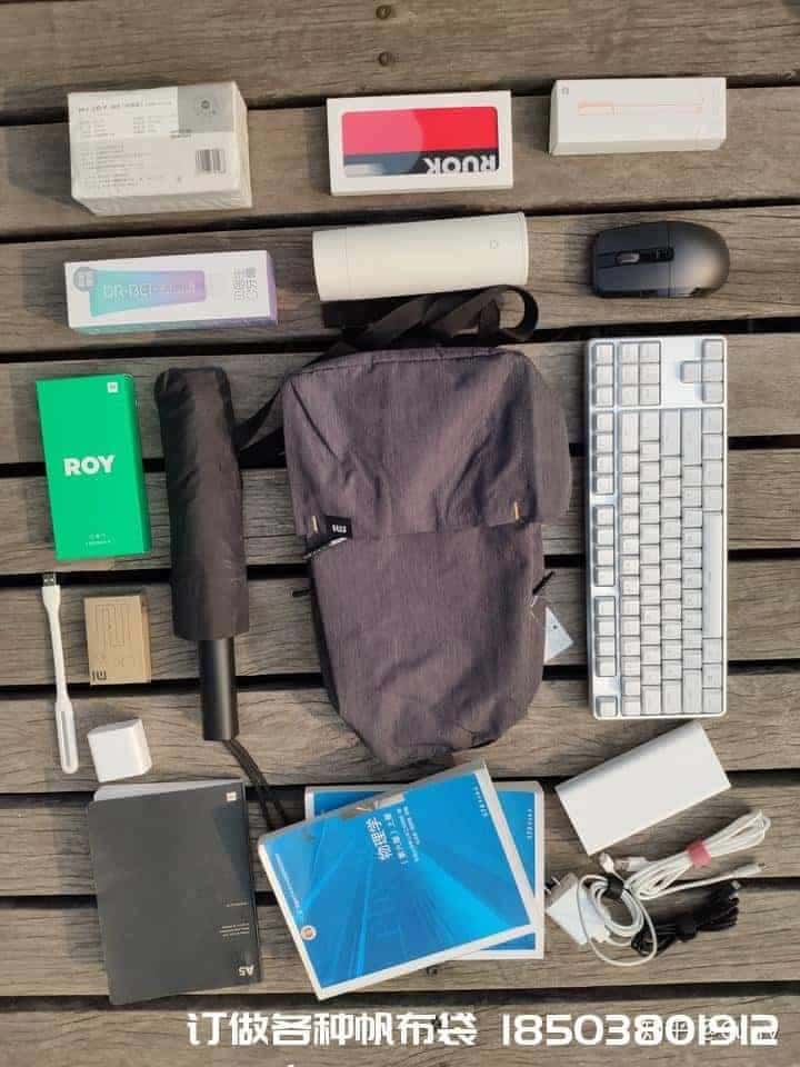 這款小小背包的收納能力到底是如何,有沒(méi)有達(dá)到官方宣稱10L容量的標(biāo)準(zhǔn),10L這樣一個(gè)數(shù)字并不是特別的直觀,那就讓我來(lái)測(cè)一測(cè)背包的實(shí)際容量(我們測(cè)得是背包得極值容量)。裝載得物如下:大家最怕得大學(xué)物理上下冊(cè)書(shū)本、小米記事本、米家隨身臺(tái)燈、小米雙口充電器、古董級(jí)的小米手機(jī)靈悅線控通話耳機(jī)、王源定制版小米9手機(jī)殼、RUOK手機(jī)殼、貝醫(yī)生牙膏、米家折疊傘、泡上枸杞的米家迷你保溫杯、小米充電寶、小米游戲鼠標(biāo)、悅米機(jī)械鍵盤pro(87健)、數(shù)據(jù)線、非常搶手的巨能寫、MIJOY抽紙。帆布購(gòu)物袋帆布袋制作電話/微信:15838231350先把雨傘和保溫杯放在書(shū)包兩側(cè)的口袋里,充電寶、數(shù)據(jù)線放在外部的小口袋中,鍵盤放在夾層區(qū)域固定,其余的都通通放在夾層外的區(qū)域里。