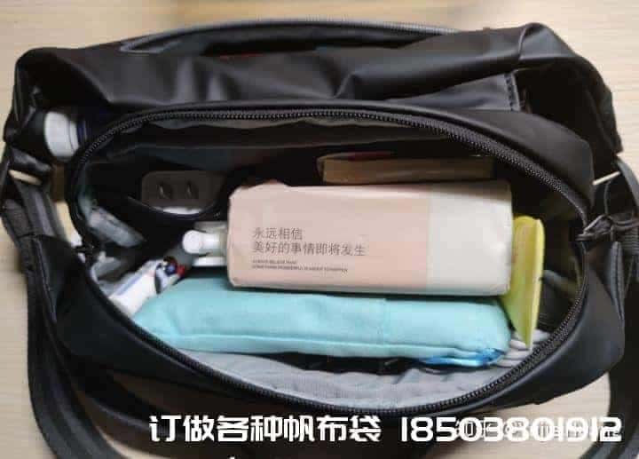 為了測試主倉區域的容量,故將移動電源*1、餐巾紙*1、藍牙耳機*1、護手霜*1、便利貼*1、潤唇膏*1、充電器*1、充電線*1、電流表*1放置在主倉內,并將一瓶水麻布袋帆布袋制作電話/微信:15838231350放置在水壺區。毫無疑問,主倉輕輕松松hold住上述所有物品。
