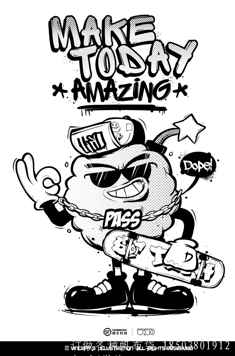 我們給腦頑童的定位是:吉祥物中的“潮人”,所以我們選用了嘻哈向的設(shè)計風(fēng)格。你可以在設(shè)定中看到像滑板、墨鏡、Gold Chain這類的元素。今后,我們希望TA能以潮玩的形式跟大家見面。