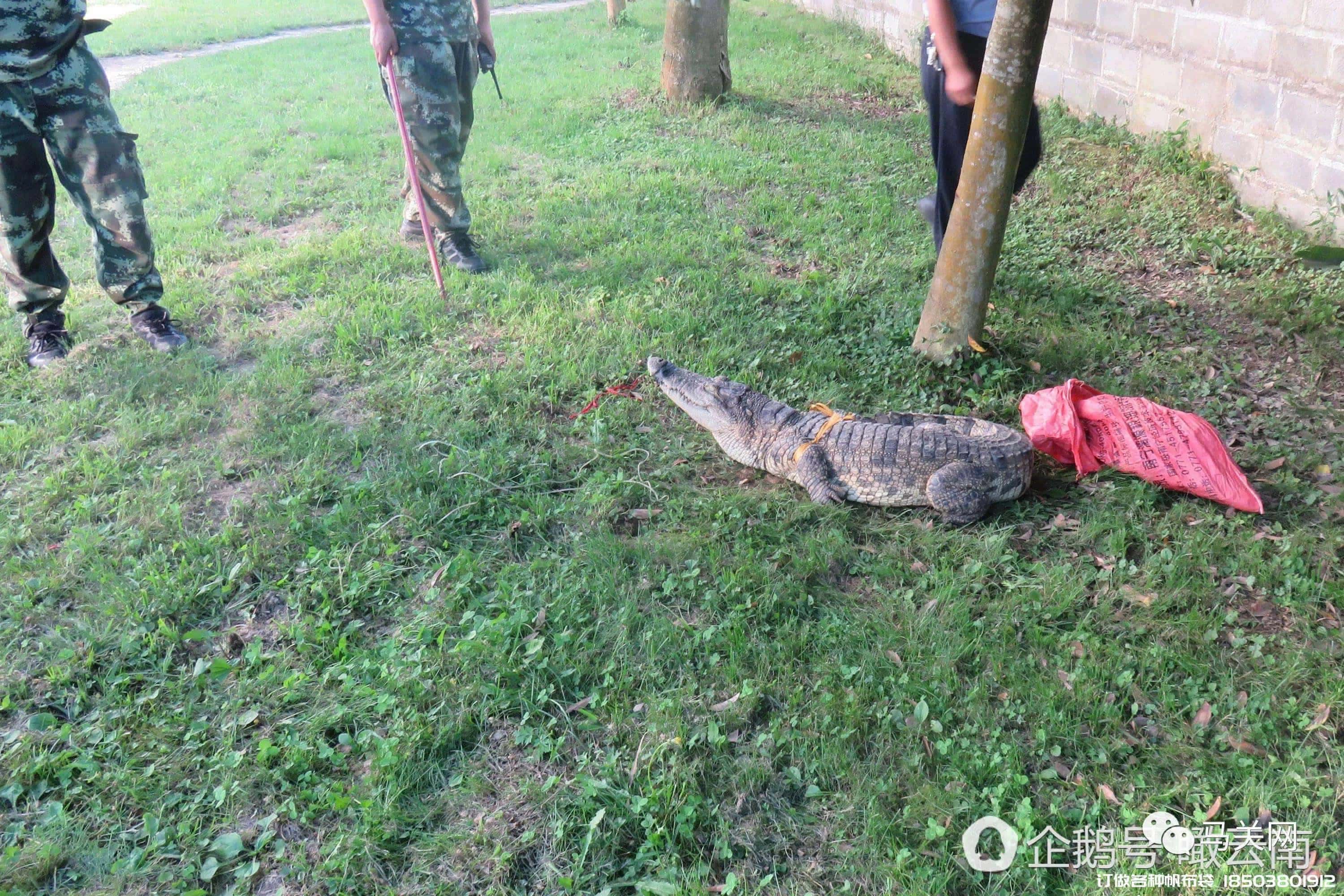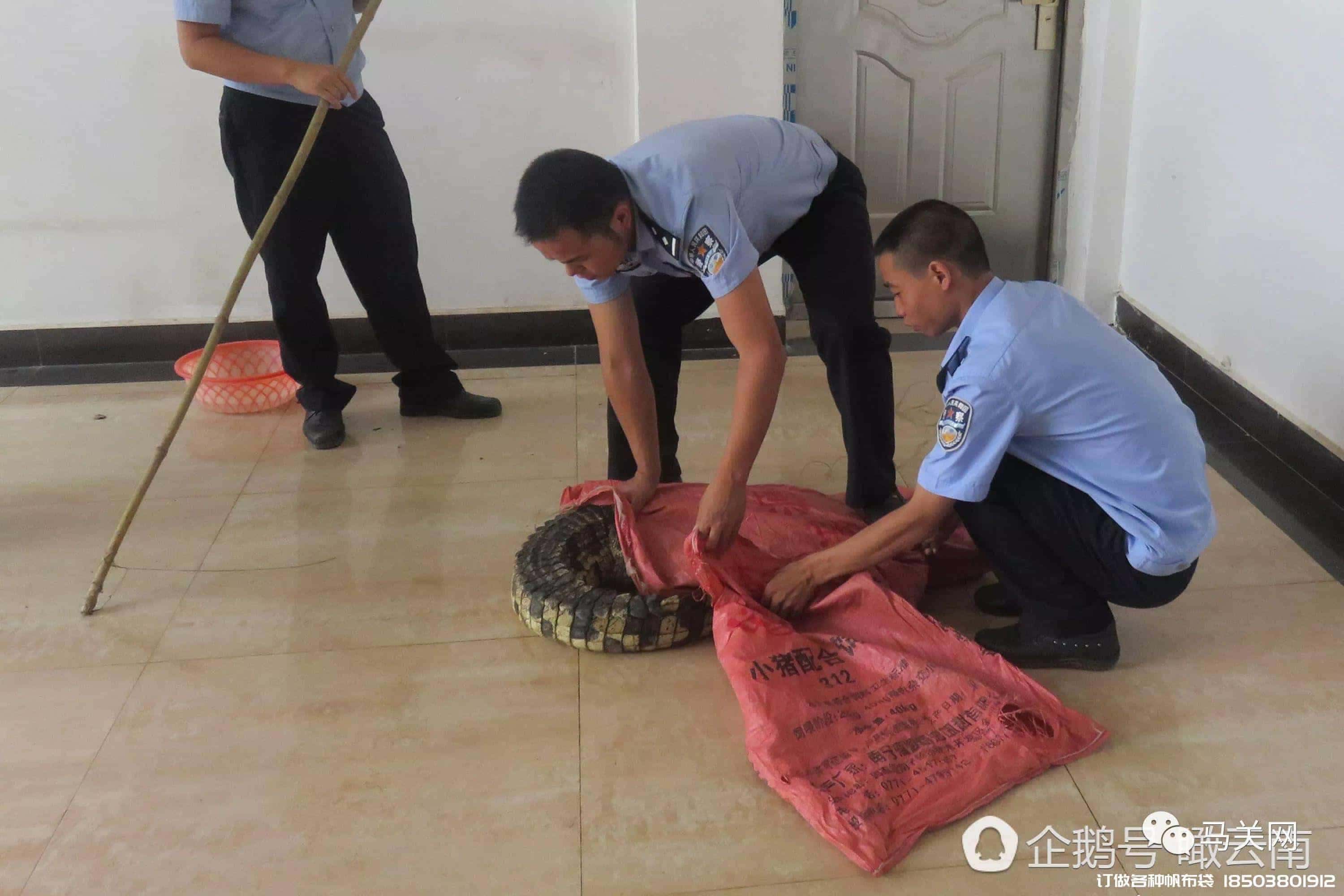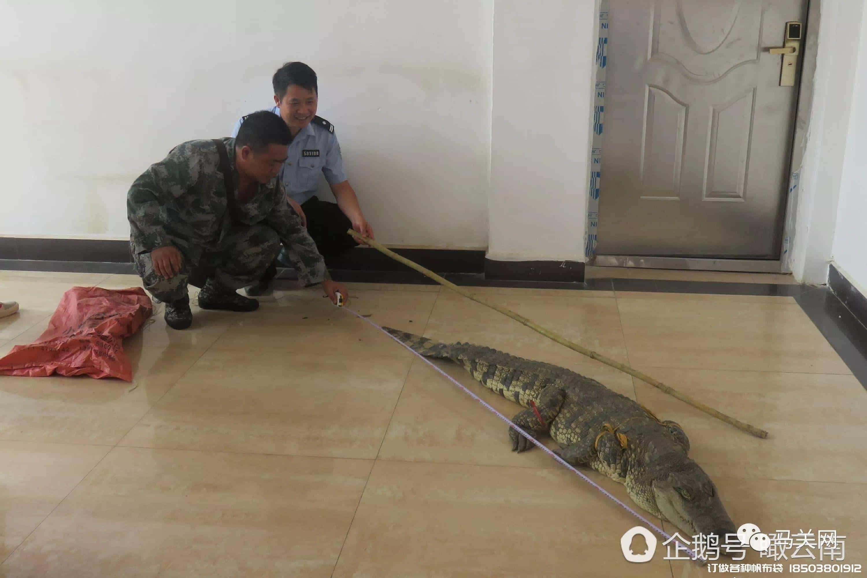 馬關森林公安民警迅速趕到金廠邊防派出所。9月19日,民警巡邏小組在老寨至金廠公路上巡邏時,發現一張摩托車載運一龐然大物,當場堵截盤查,打開紅色的大編織袋,讓盤查武警嚇了一跳,里面裝著的龐然大物竟然是一條兇猛的活體大鱷魚,對著人一副攻擊的架式。
