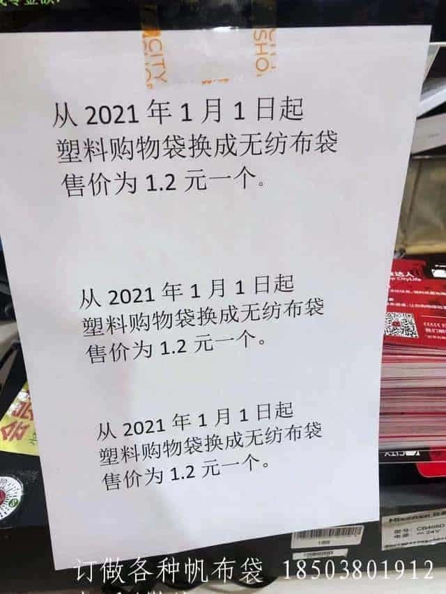 城市超市上海影城店的收銀臺上貼著這樣一張告示:“從2021年1月1日起,塑料購物袋換成無紡布購物袋,售價為1.2元一個?!庇浾呖吹绞浙y臺上正放著一沓無紡布購物袋,規格相當于中等購物袋大小。
