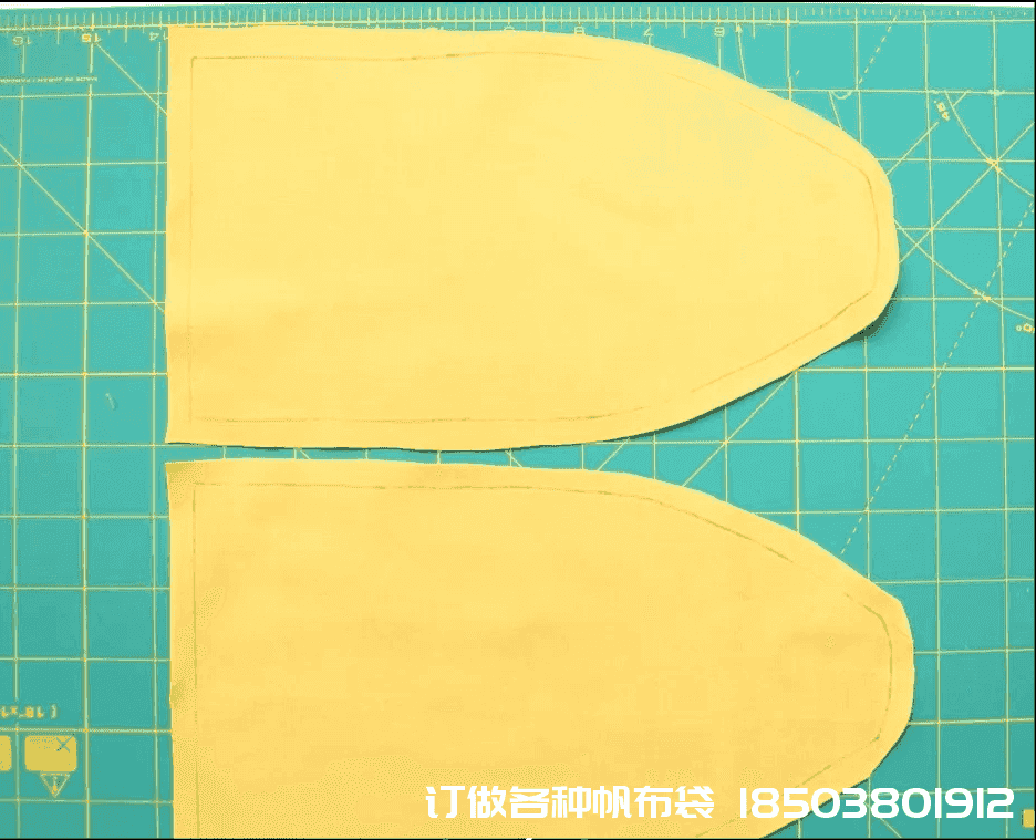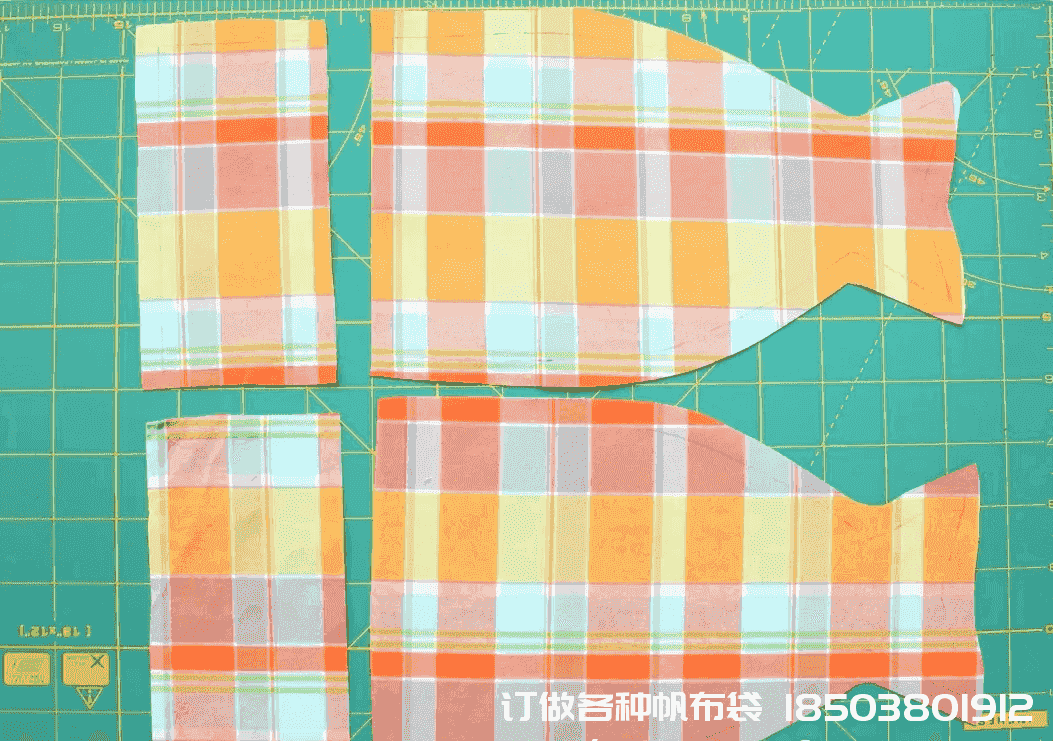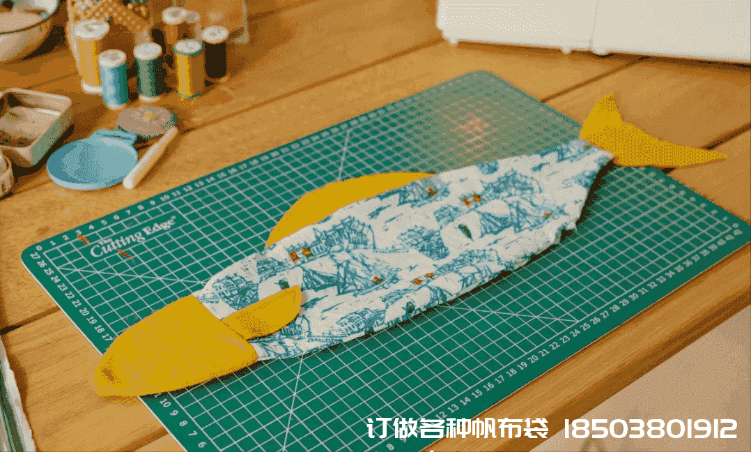 帆布袋制作電話/微信:15838231350把圖紙放在布上畫出,剪兩塊布做魚身,魚頭。