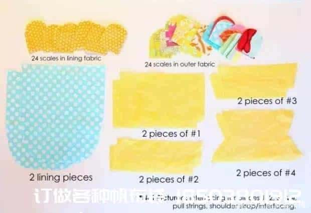準備兩塊做魚身的里布,魚鱗24塊(背面可用同一個顏色)魚鱗外面的布可用各色24塊,魚嘴2塊,魚尾2塊,魚上半身2塊,魚下半身2塊。