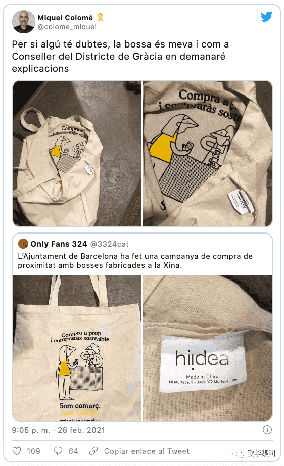 在事情發(fā)酵了幾個小時后,人們發(fā)現(xiàn)這些袋子不僅來自中國,還有些是在印度生產(chǎn)的。除此之外,這些帆布包不僅不在巴塞羅那生產(chǎn),連銷售商都位于馬德里。