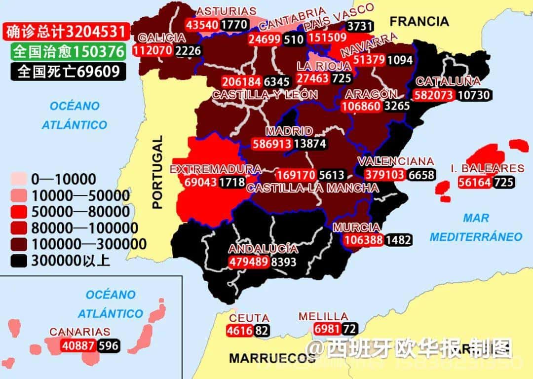 3月1日西班牙24小時內(nèi)新增1159例確診患者,馬德里(176),卡斯蒂利亞·萊昂(138),阿斯圖里亞斯(101),加納利(96),安達盧西亞(86),瓦倫西亞(79),阿拉貢(64),納瓦拉(42),坎塔布里亞(39),加利西亞(31),穆爾西亞(26),里奧哈(13),埃斯特雷馬杜拉(12),休達(10),梅利亞(5),卡斯蒂利亞拉曼?。?),加泰羅尼亞(0)。