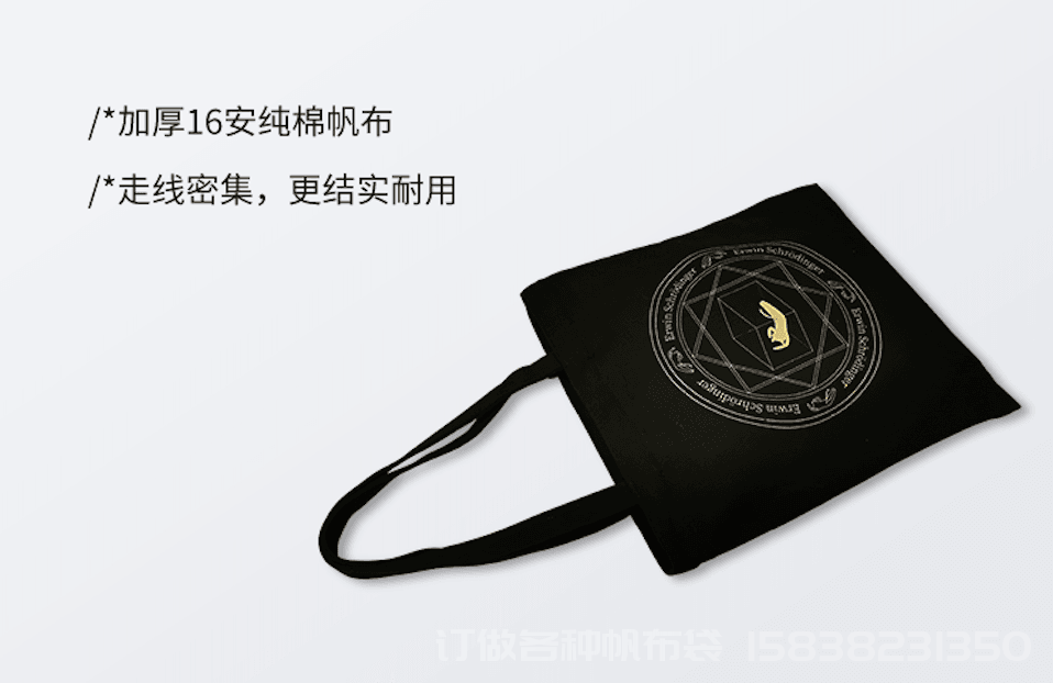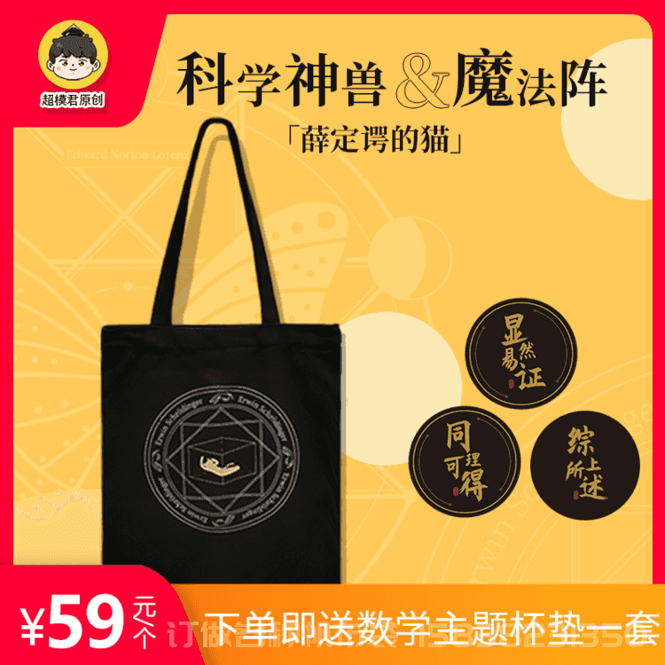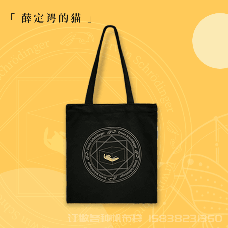 又或者逛街時,只需帶上手機和鑰匙,這時一個顏值高袋子會更方便和賞心悅目。當我們外出旅行或出差時,碩大的行李箱裝著衣物電腦等大物件,小東西放在一個袋子里不是更省心省力嗎?碰上的是夏天的話,背包貼著你的后背,那種悶熱的感覺絕對會讓你想要一個更輕巧的袋子。但無奈很多人都覺得男生背著個帆布袋太娘,便錯過了這一實用的寶貝。超模君一直想設計一個數理哲主題的帆布袋,來打破這個誤區。在經過一段時間的打磨后,超模君發現了一款好用的帆布袋必備的幾個要素。超模君在經過多家對比后,選擇了加厚16安純棉帆布。安數是帆布的經緯密度,業內最高是20安,其次就是16安,日常生活中完全夠用。一個袋子裝得多還不行,到了關鍵時刻還的能迅速找到自己想要的東西。于是超模君選擇加上了一個小內袋,在你需要一些重要的小物件如手機時可以馬上拿到。除此之外,在擠地鐵和上公交時,背著一個袋子多少會有點忐忑。但很多帆布袋的防盜措施真的一般,一個敞開口子的袋子基本等于對小偷說“歡迎光臨”。因此超模君特意在帆布袋上加上了防盜拉鏈,這樣你就可以更加放心地帶它出門了。最最最重要的是,這款帆布袋背起來絕對不會讓男生顯得“娘”,女生背起來也更好看。與市面上的其它帆布包不同,這次我們在外觀上選用的是“科學神獸”主題的圖案。格局上就給人一種高大上的感覺!背上后這世上就只有兩種帆布袋,一種是你背的,一種是其它。它們分別是斐波那契的兔子、薛定諤的貓和洛倫茲的蝴蝶。對物理和數學稍有了解的人應該都聽過它們的大名。斐波那契兔子背后的黃金數列、薛定諤的貓背后的量子物理、洛倫茲蝴蝶背后的混沌學,都是改變了數學和物理學進程的存在。三只神獸以黑金主題印在了帆布袋上,背上去的瞬間就充滿了一股濃濃的知性風,理性和獨特的氣質一覽無遺。讓人人都愛上數理化,是超模君開發數理哲主題的文創產品的初衷。把晦澀的知識點放入生活中,用高深的原理公式裝點生活。《薛定諤的貓:漫畫大科學家的小萌寵》以科學史上十個“神獸”內容為主,仍是和郝志峰教授聯手打造。郝志峰:廣東省“千百十”工程省級人選、美國數學會會員、教育部2001-2005年高等學校數學與統計學教學指導分委員會委員、廣東省數學會副理事長、廣州工業與應用數學會理事長、中國決策科學研究會理事。獲國家政府特殊津貼。