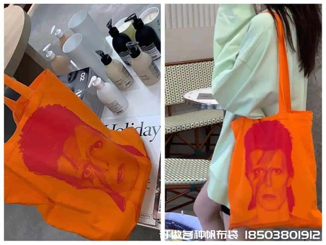 這是阿希哥家最新的新品,一款雙面帆布包,超級有設(shè)計感!都給我買它啊!包身像個橘子精轉(zhuǎn)世,正面是搖滾ju星David Bowie的頭像印花,背面是對應(yīng)的英文字母拼寫,整個搭配在一起真的顏值超群!