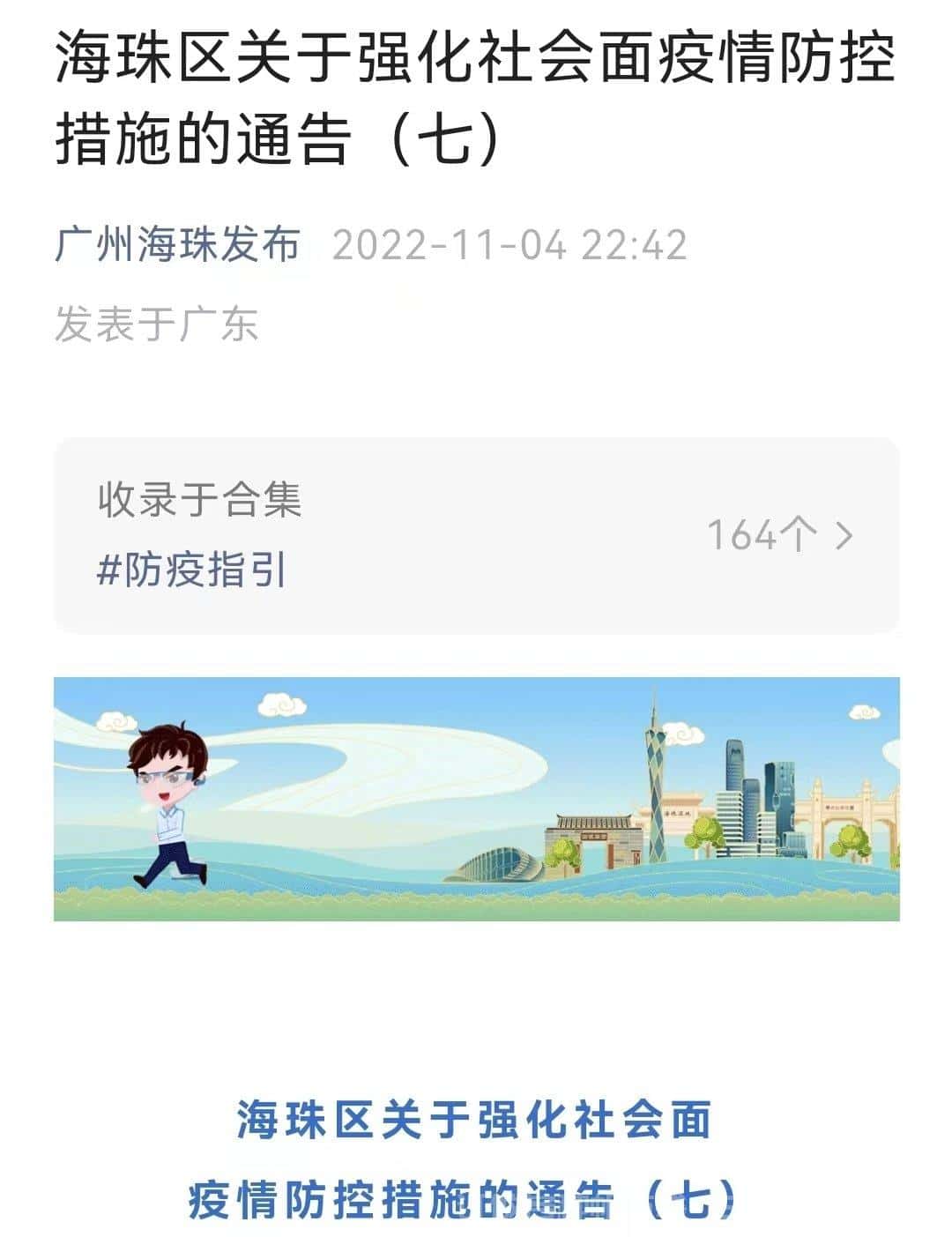 據廣州海珠發布微信號消息,11月4日晚,廣州市海珠區新型冠狀病毒肺炎疫情防控指揮部辦公室發布通告,為有效阻斷疫情傳播擴散風險,盡快實現社會面動態清零,切實保障廣大人民群眾生命安全和身體健康,經研判,決定11月5日0時至11月7日24時,在海珠區全域實行如下防控措施: