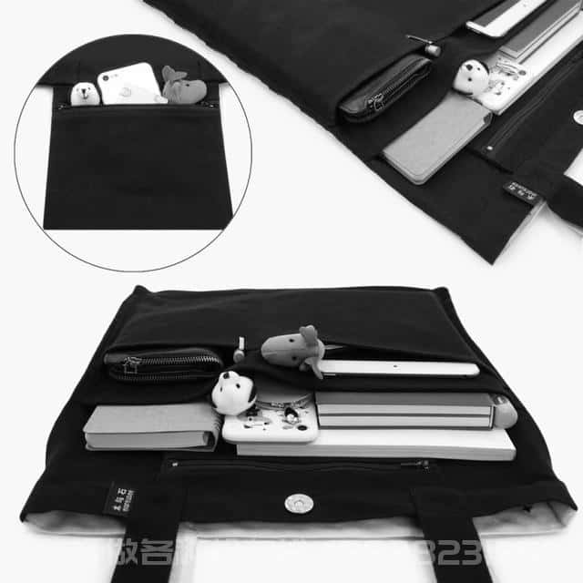 其實帆布包有個通病,那就是容量很大,同樣也有個壞處,那就是大雜燴一樣,所有東西都堆在一起,要找一樣小東西的時候經常手忙腳亂。這款帆布包的內部設計就解決的這個問題,它內部有大中小三個SIZE的口袋,方便大家隨意擺動物品。