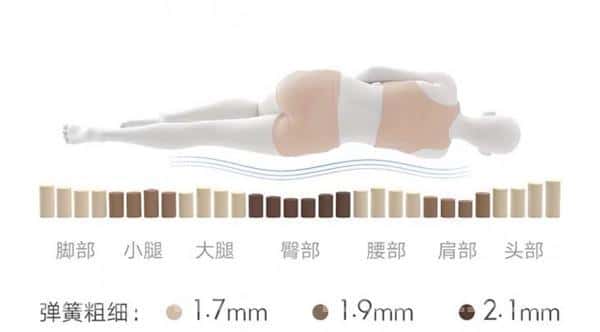 也正是由于這個特性,很多商家就玩起了概念:分區床墊。有3分區、5分區、7分區,聽上去是項神奇的技術,其實就是通過為不同彈性系數的彈簧分區,組合成整張床網,以達到不同接觸面,不同支撐力的感受。