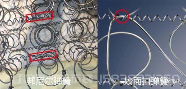 邦尼爾彈簧出現的比較早,30年前常見這樣的彈簧工藝,單個彈簧是「錐型的彈簧芯結構」兩頭大中間小,通過串簧(螺旋鎖)連接。回彈力不錯、受力平衡性較好。