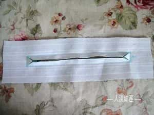 裁一條約30*10cm布條,與里布正面相對,如圖畫出長方形框,長度為20cm即內袋拉鏈長度,寬度為1.5cm。