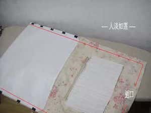 ▼10.拿做內貼袋的棉布38*18cm一片,把它縫在另外一片里布上:如圖紅色線,中間壓線,變成一大一小兩個貼袋: