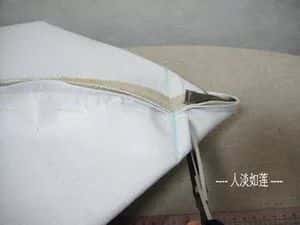 ▼15.把長拉鏈縫在里布上面,注意拉鏈背面與里布正面相對: