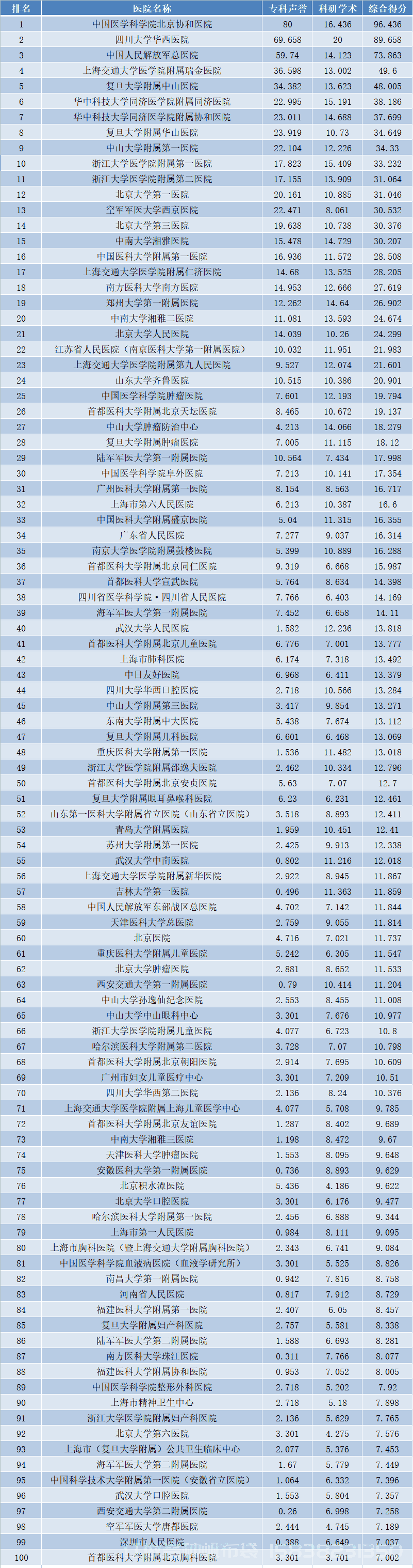 綜合排名:北京協(xié)和醫(yī)院、華西醫(yī)院分別位列第一、第二