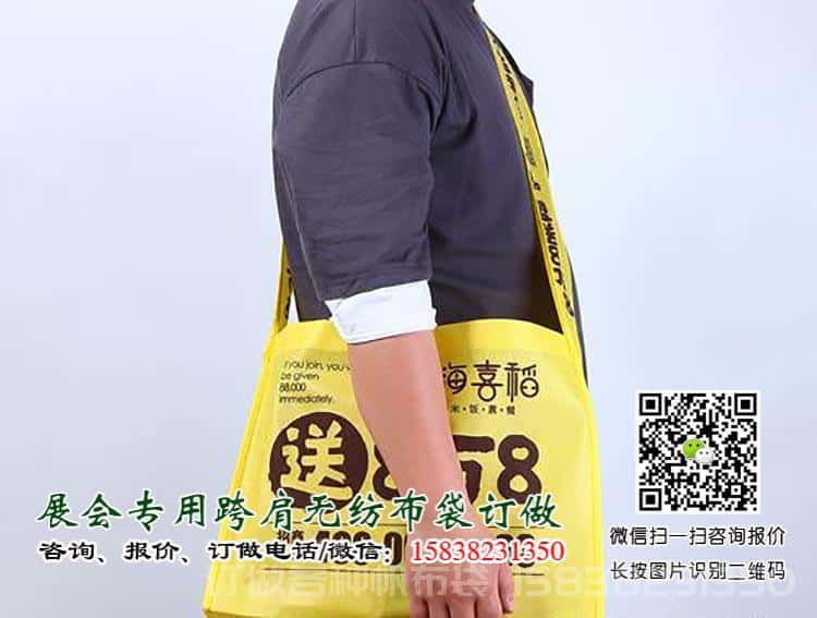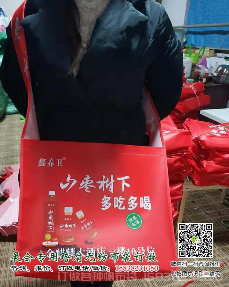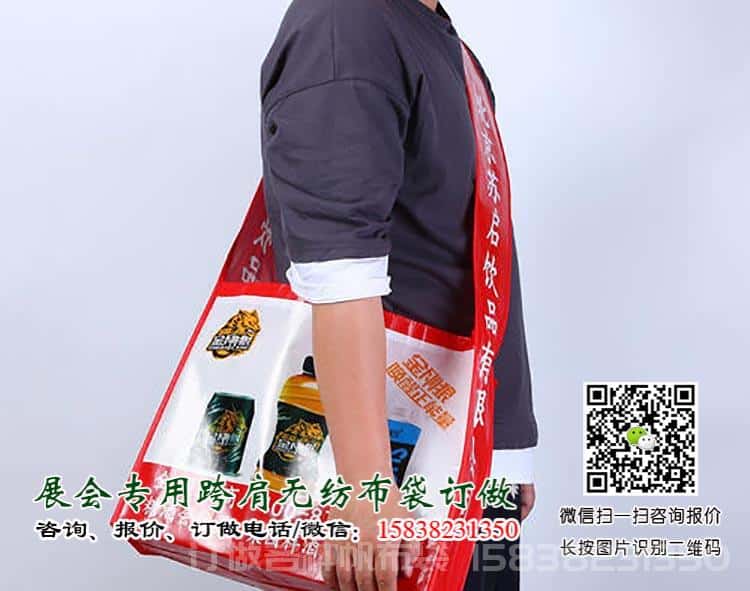 我廠專業生產無紡布袋多年,尤其擅長制作這種展會專用跨肩式無紡布袋,聯系電話/微信:15838231350,歡迎來電咨詢,可免費郵寄樣品。