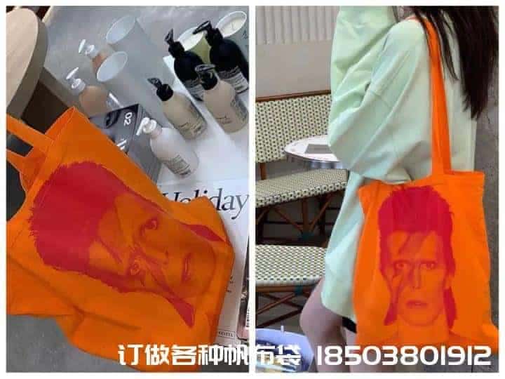 這是阿希哥家最新的新品,一款雙面帆布包,超級(jí)有設(shè)計(jì)感!都給我買它啊!包身像個(gè)橘子精轉(zhuǎn)世,正面是搖滾ju星David Bowie的頭像印花,背面是對(duì)應(yīng)的英文字母拼寫,整個(gè)搭配在一起真的顏值超群!