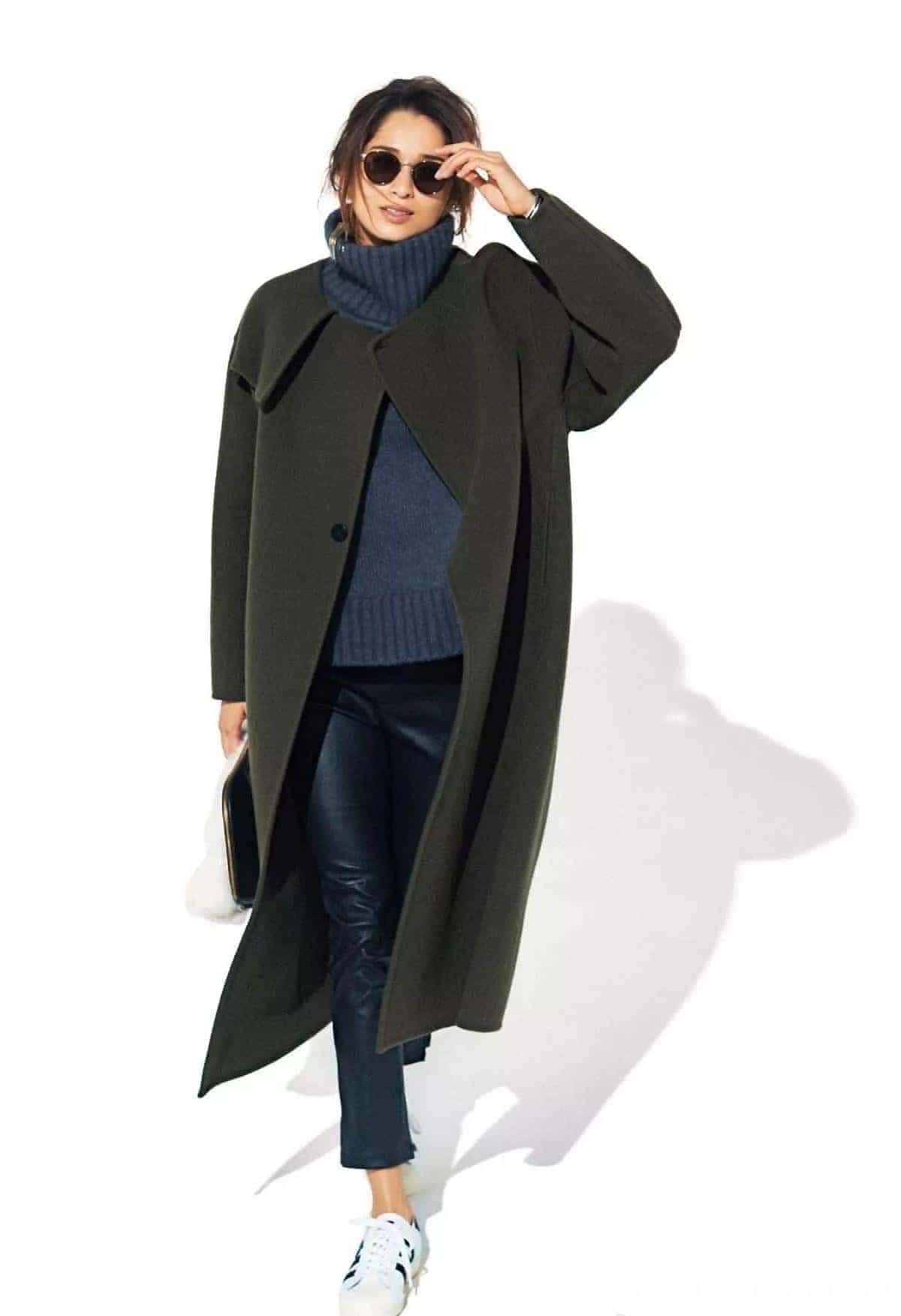 像這套穿搭,也采用的是闊腿褲和帆布鞋的組合,可以呈現出一種干凈利落的畫風,尤其是配合了短款設計的大衣時,可以利用褲裝來實現對身材的調整和潤色作用。