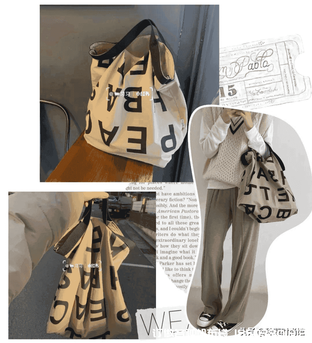 字母款帆布包應(yīng)該是最不挑穿搭的了,白色帆布加上黑色字母,簡約干凈,隨便一拍就很有ins風(fēng)味兒。