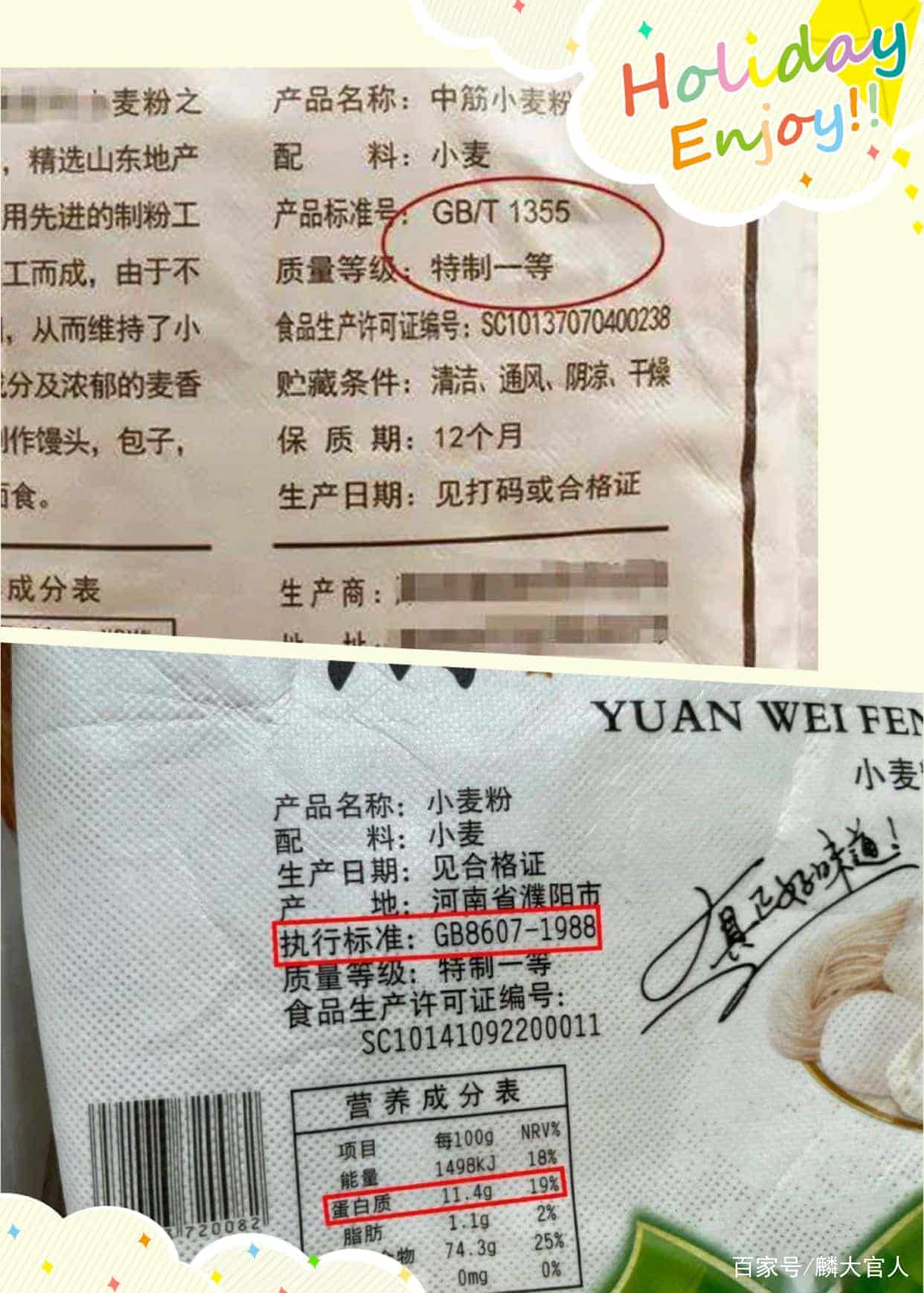 以上3種是正規且合格生產的低中高筋面粉對應的執行標準編號,如果您買的面粉不是以上的執行標準,一般可能都是不合格的面粉,除非您買的面粉是一些專用小麥面粉,也有LS/T3201開頭的一些,除此之外大部分都符合以上3條編號,否則就是不合格的面粉哦。