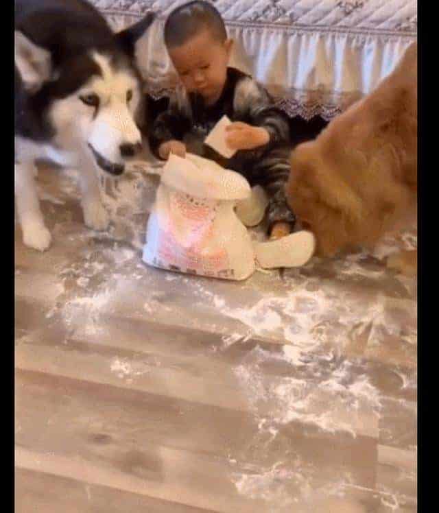 就有這么一位網友,家里養了有兩只狗狗,一只金毛犬,還有一只哈士奇。本來這兩個家伙就夠主人伺候的了,而網友還有個調皮搗蛋的孩子,他們三總是會做一些讓主人哭笑不得的事情。這一天網友睡覺醒來,發現兒子把廚房的面粉給拿出來了,而且還解開了袋子,里面的面粉都撒了一地!