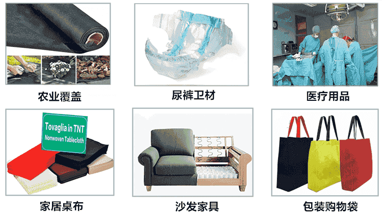 10~40gsm用于醫療衛生用品,如口罩、醫用一次性隔離服、頭套、鞋套、紙尿褲、成人尿失禁及衛生用品等 ; 17~100gsm(3%紫外線)用于農業覆蓋,如作物覆蓋地被、根控袋、種子袋、除草墊,苗圃保護套、保溫簾、地面防護等; 40~120gsm用于家居用品,如衣柜、儲物盒、桌布、防塵罩、墻紙、日歷等;50~120gsm用于包裝材料,如購物袋、西裝套、禮品袋、茶包、大米面粉袋、花材包裝等;100~150gsm用于百葉窗、汽車內飾、攝影背景布、廣告布等。