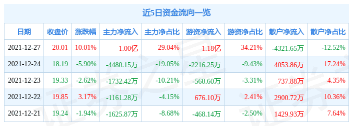 資金流向數(shù)據(jù)方面,當(dāng)日主力資金凈流入1.0億元,游資資金凈流入1.18億元,散戶資金凈流出4321.65萬元。近5日資金流向一覽見下表: