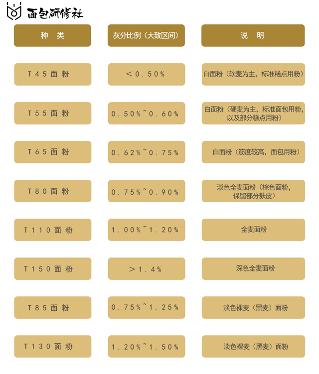 德國粉以“Type+數字”來進行標記和區分,數字的高低代表了礦物質含量的高低。Type812、Type1050、Type1060、Type1150常用于制作面包。其中Type1050與Type1060是全麥面粉,Type1150是黑裸麥粉。
