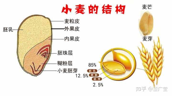 一粒小麥中胚乳所占的比重為85%,麥芽約占2.5%,麥皮約占12.5%,因小麥品種不同,各部位所占比重也略有不同。