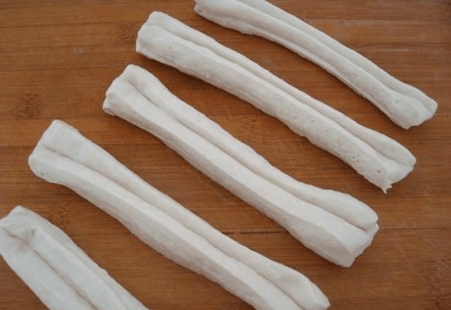 第三步:案板上撒上一層干的面粉,然后把面團取出來,把面團放在案板上,用搟面杖輕輕的把面團搟平一些,厚度要差不多半厘米左右。然后再把搟好的面片準備好,兩片面片疊在一起,然后用筷子在中間壓一下,就成了油條的最原始形態(tài)。鍋里加入適量的食用油,油熱之后,就把油條放下去炸,炸的時候手和筷子都不要有水分。炸的時候,用筷子適當?shù)姆D(zhuǎn)一下油條,讓油條均勻受熱,讓它在里面轉(zhuǎn)圈,炸出來的油條才會好看又好吃。