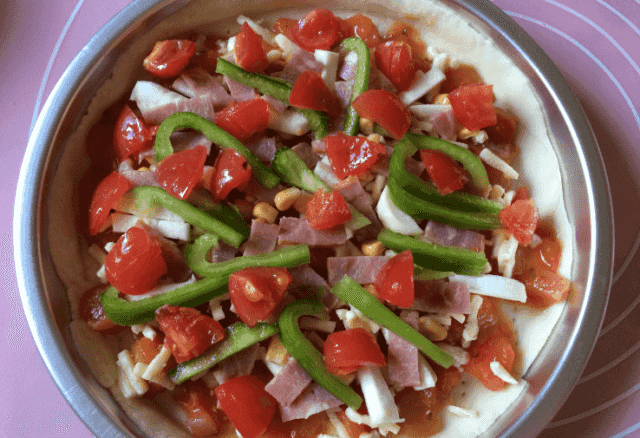 第四步:如果喜歡吃蔬菜,還可以多備一些蔬菜,這樣吃起來更香。面團發(fā)好之后搟成8寸的披薩盤大小,然后用叉子戳一些小孔,接著抹上一層西紅柿醬,撒上準備好的蔬菜和奶酪,接著倒入切好的培根,最后將剩余的奶酪、西紅柿將全倒入披薩餅上都可以了。把披薩放入烤箱蒸15分鐘左右就可以了!