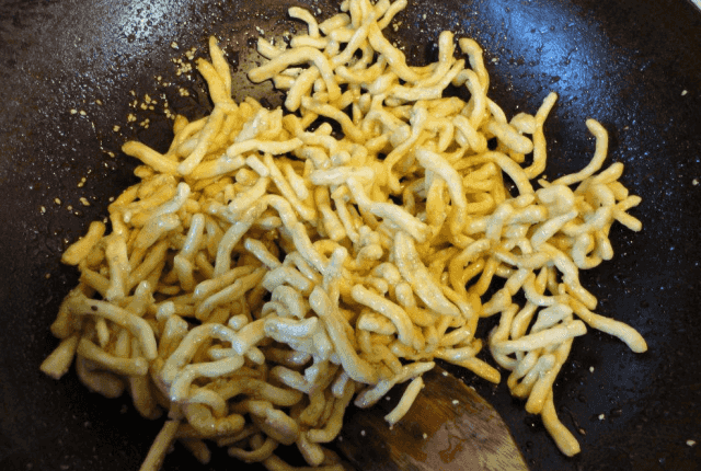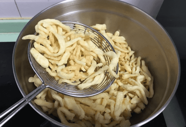 第二步:切好之后,用大火將鍋燒干鍋,鍋干后倒入適量的油,等油差不多5成熱時,將切好的長條放入鍋中炸至成形。面條炸成型后撈出瀝干,然后放入盆中備用。把鍋中多余的油倒出放入白糖和水。