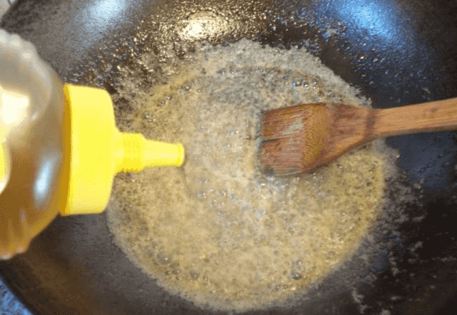 第三步:用中火將糖熬至粘稠粘稠后,再加上適量的蜂蜜攪拌均勻,然后將炸好的面條倒入鍋中翻炒,翻炒均勻之后,將面條塞入容器中壓實,壓好之后,蓋上保鮮膜密封,放在冰箱里冷藏一會兒就可以了。