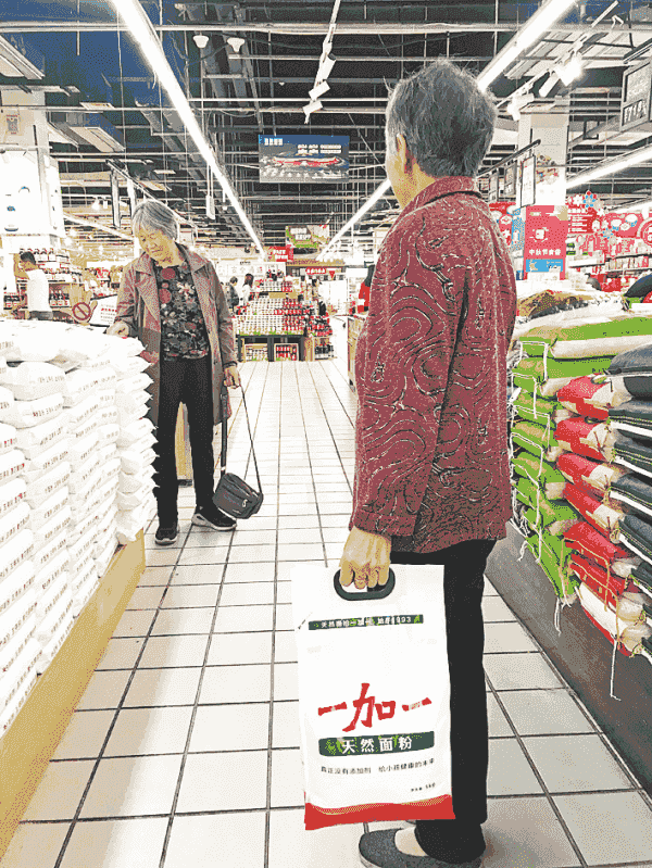 在市區喜盈門超市中心店,米面糧油庫存充足,面粉的包裝規格以10公斤和25公斤居多。有一位王姓女顧客經過挑選,購買了一袋5公斤裝的一加一天然面粉。據她介紹,家人吃得不多,她首選健康放心的面粉。還有一位年長的女顧客買了一袋產地周口的特價面粉,10公斤裝的價格和一加一5公斤的價格接近。她說一加一的面粉有點貴。她也知道質量好,沒有添加劑,但由于退休工資不高,天天在家蒸饃做飯,一個月得兩袋面,買便宜的就行。超市經常有特價的面粉,誰的做活動就買誰的。