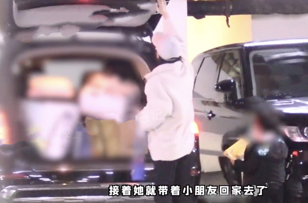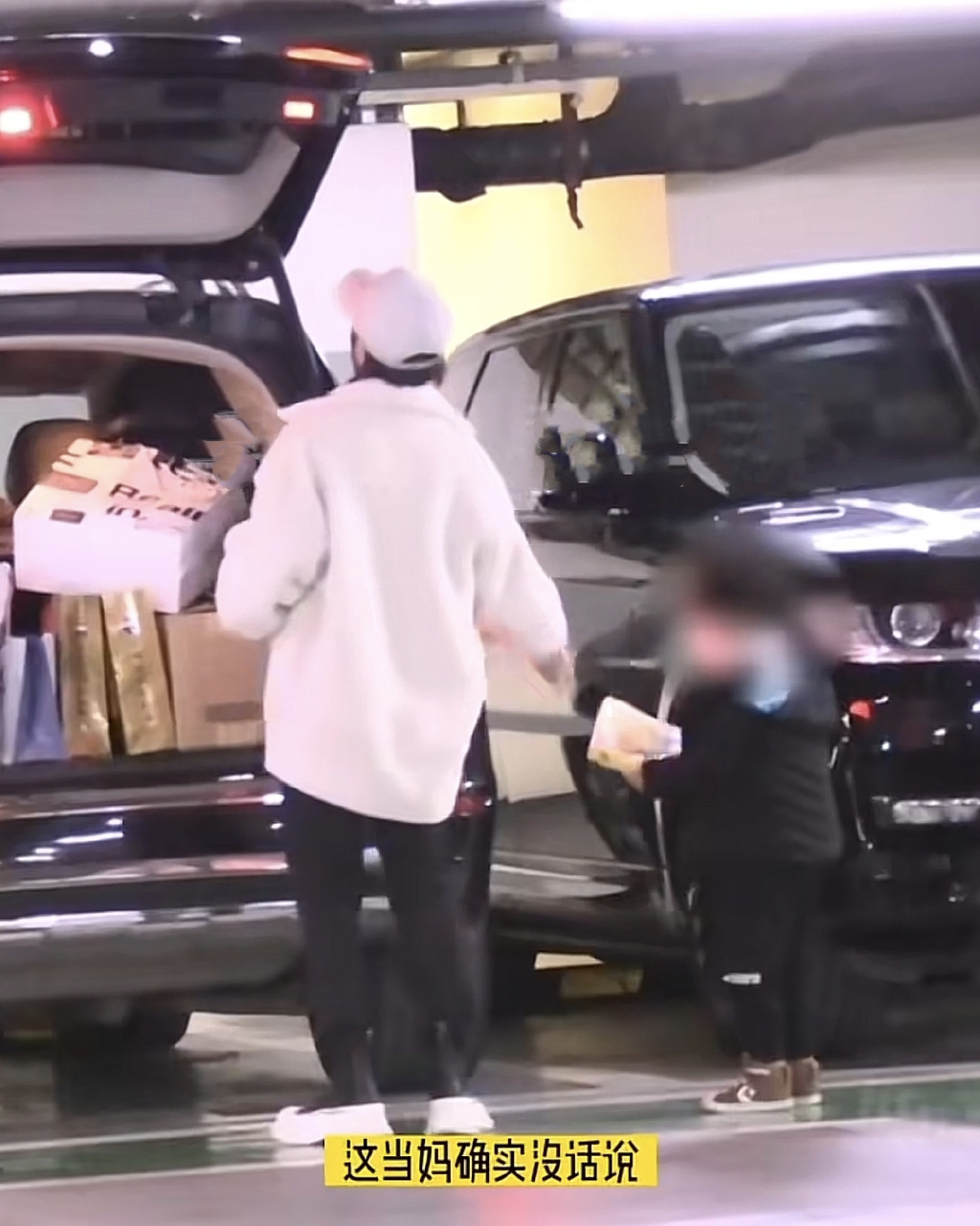 找到自己的車后,謝楠打開了后備箱,從里面拿出了一個玩具遞給兒子。
