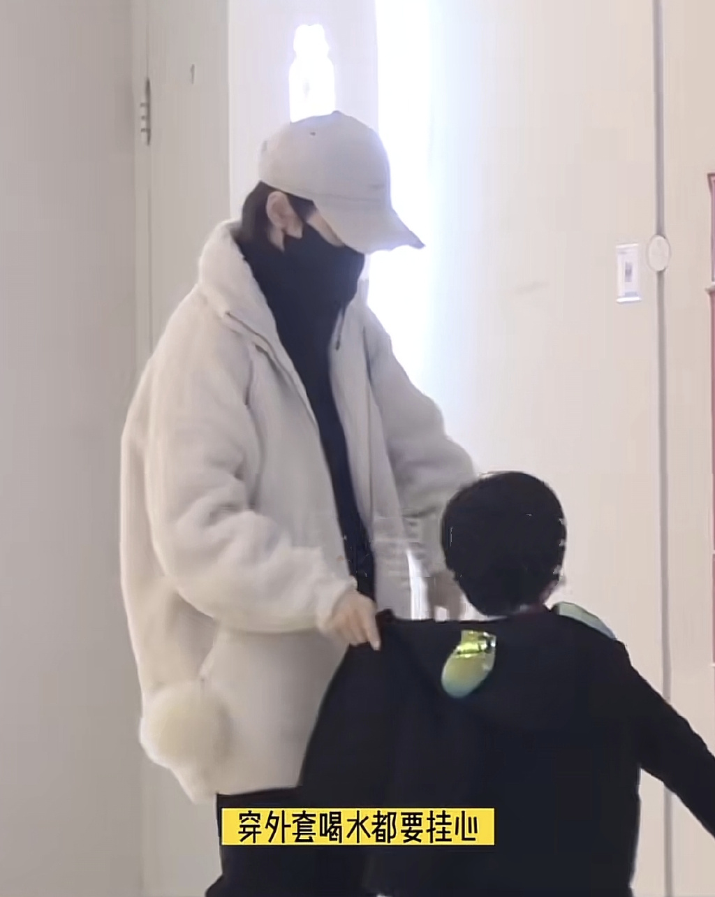 謝楠擔心兒子會凍著,給他把衣服穿上保暖,又讓兒子喝了口水,照顧得無微不至。